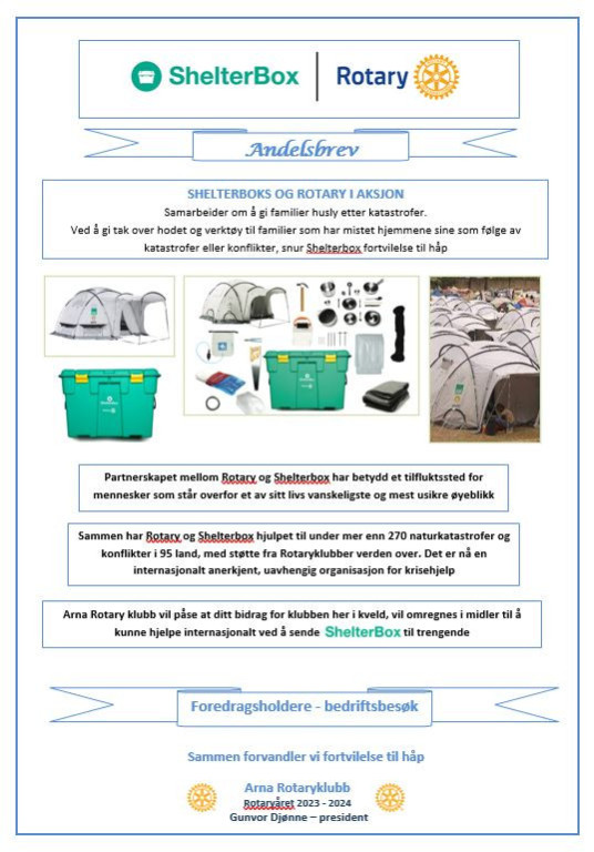 De har gitt oss medlemmer viktige bidrag til kunnskap og læring. Som takk har vi gitt midler til å kjøpe 2 shelterboxer til trengende etter katastrofer.